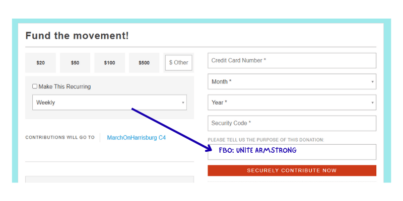 -Once there, be sure to designate your donation for the benefit of, or “FBO: UNITE ARMSTRONG” (blue arrow)